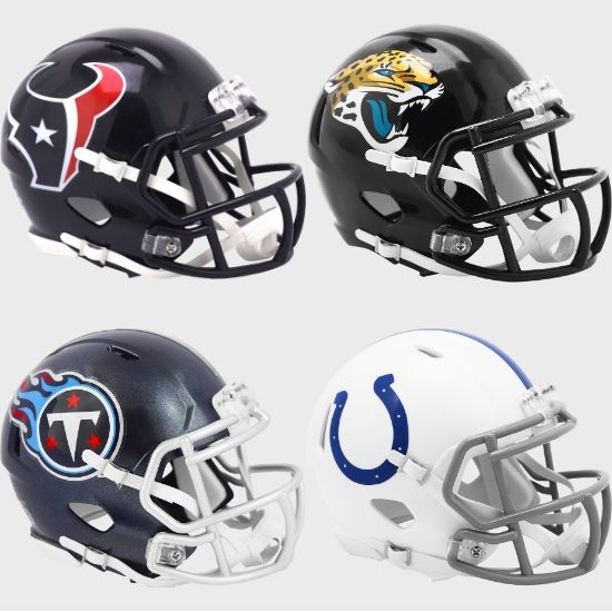 You will receive a Houston Texans, Tennessee Titans, Indianapolis Colts & Jacksonville Jaguars mini helmet. The greatest miniature sports collectible ever! Approximately 1/2 scale versions of NFL helmets. ABS plastic shells with plastic facemask and authentic-looking team decals. This helmet has become a staple in the collectibles market for several good reasons. It's affordable, doesn't take up too much room and showcases an autograph like nothing else! Once you start your collection you'll be hooked!