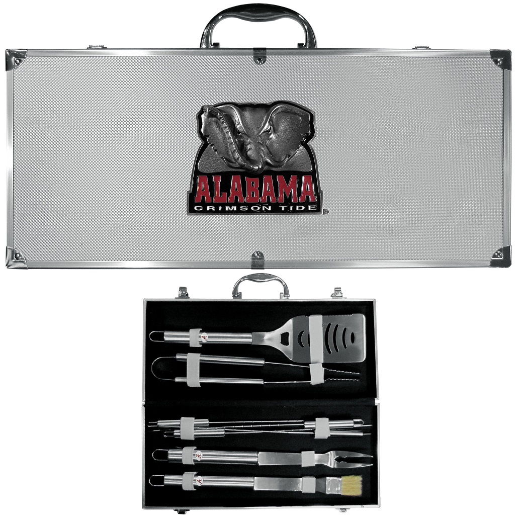 This is the ultimate Alabama Crimson Tide tailgate accessory! The high quality, 420 grade stainless steel tools are durable and well-made enough to make even the pickiest grill master smile. This complete grill accessory kit includes; 4 skewers, spatula with bottle opener and serrated knife edge, basting brush, tongs and a fork. The 18 inch metal carrying case is perfect for great outdoor use making grilling an ease while camping, tailgating or while having a game day party on your patio. The tools are 17 inches long and feature vivid team graphics. The metal case features a large team emblem with exceptional detail. This high-end men's gift is sure to be a hit as a present on Father's Day or Christmas.