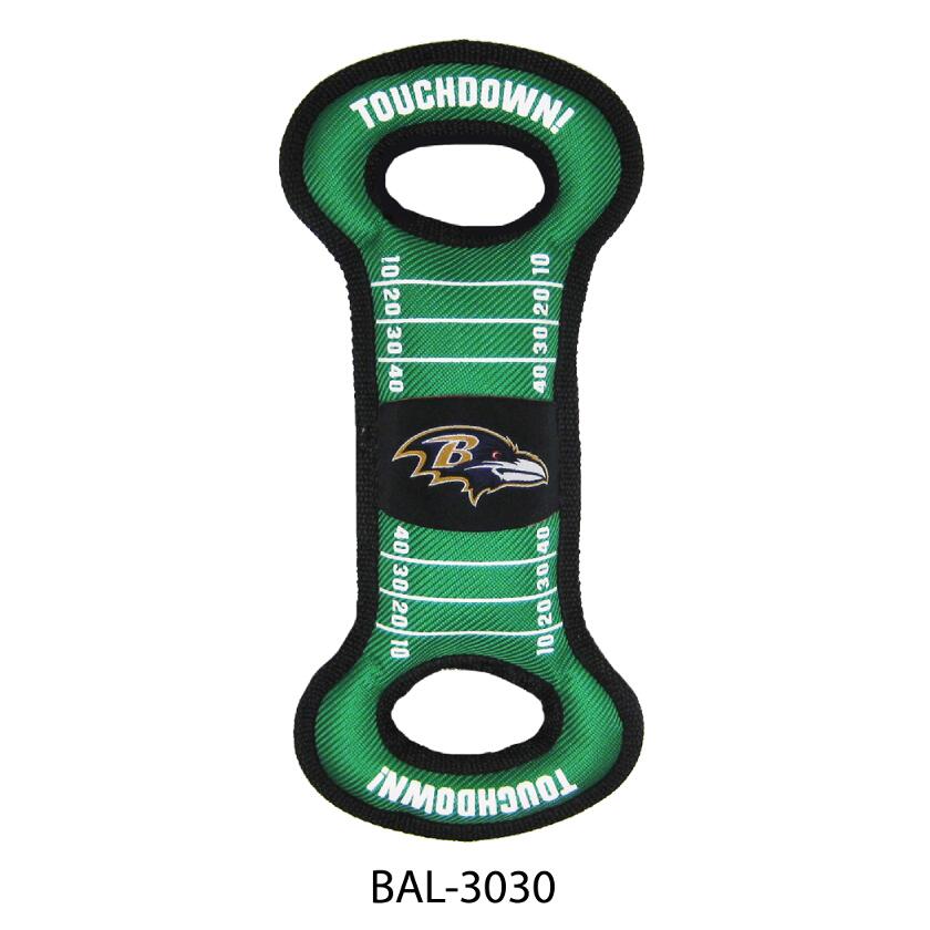Tough Nylon tug toy, Polyfill and squeaker, Nylon web binding, Team woven logo over screened football field graphics This item cannot be returned for hygeniec reasons.
