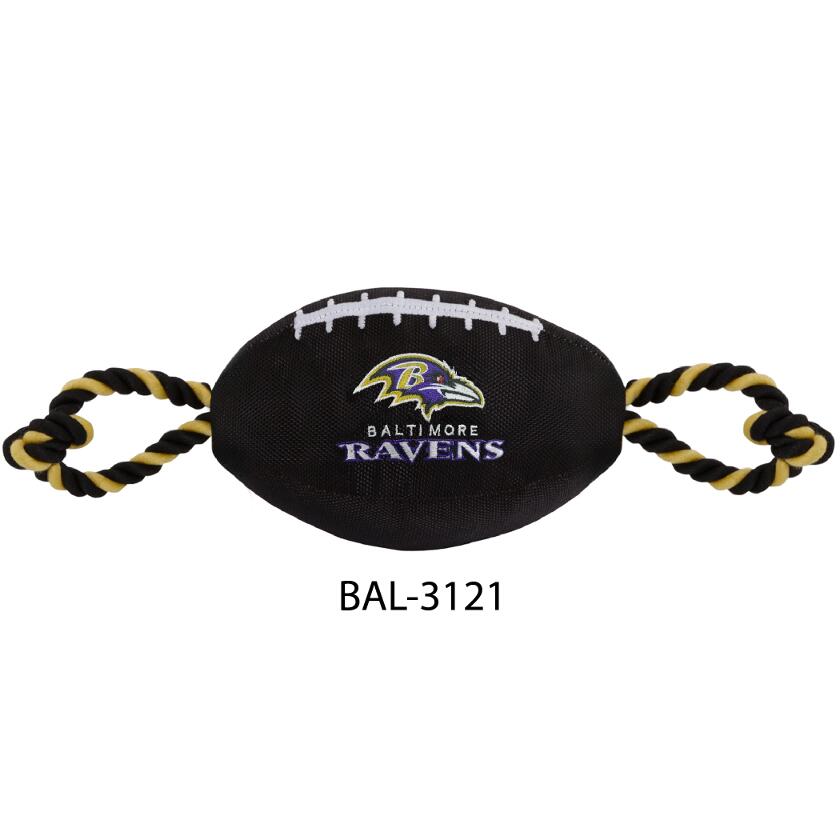 Nylon Football with Rope Toy, Made with heavy duty nylon material, Poly-filled with internal squeaker, Team logo embroidery on front This item cannot be returned for hygeniec reasons.