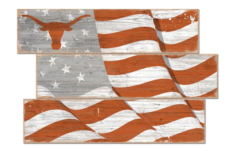 Here's a great way to display your fan loyalty with this cool three plank wall sign by Fan Creations wth your team's logo and the American Flag! Digitally printed on Medium Density Fibreboard (MDF), it features three individual 6" x 24" panels and a distressed white background with team logos, team name and date established. Proudly hang it in the office, the game room or man cave.