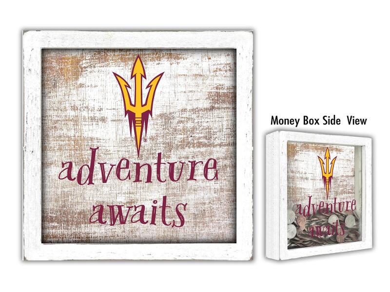 The Adventure Awaits Money Box is a stylish way to save up for your next adventure while showing off your team pride. This money box features your favorite team's logo and the phrase "Adventure Awaits" below it, making it a perfect addition to your desk or countertop. Cut and printed on durable MDF and acrylic materials, Printed and assembled in the USA