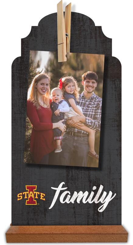 Display your family memories with this 6x12 piece that features your favorite team's logo and a clip above it to hang your photo. The bottom of the piece says "Family" with your team's logo beside it. Cut and printed on MDF, Made in the USA