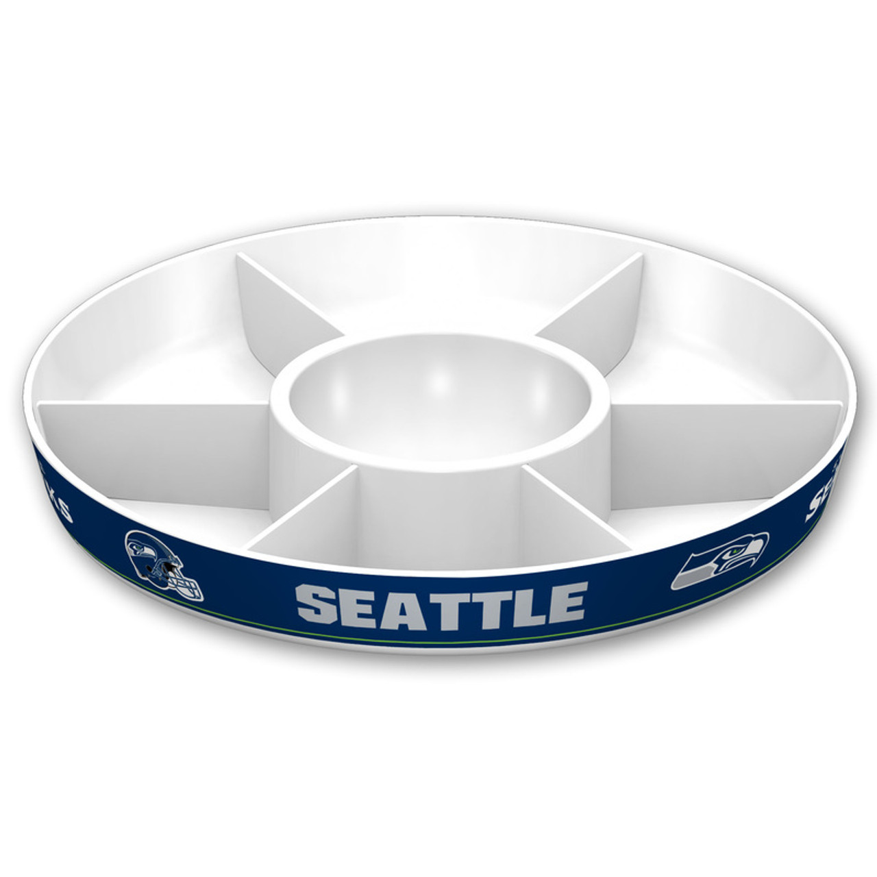 Snack in spirited style with this versatile Party Platter! Bright and bold 14 1/2" dia. melamine platter features your favorite football team graphics and colors and can be used alone or with custom dividers. Includes 6 removable dividers and a dipping bowl, so you can choose from 7 different serving configurations by simply sliding the slotted pieces together. Specify team. Hand wash with mild soap.
