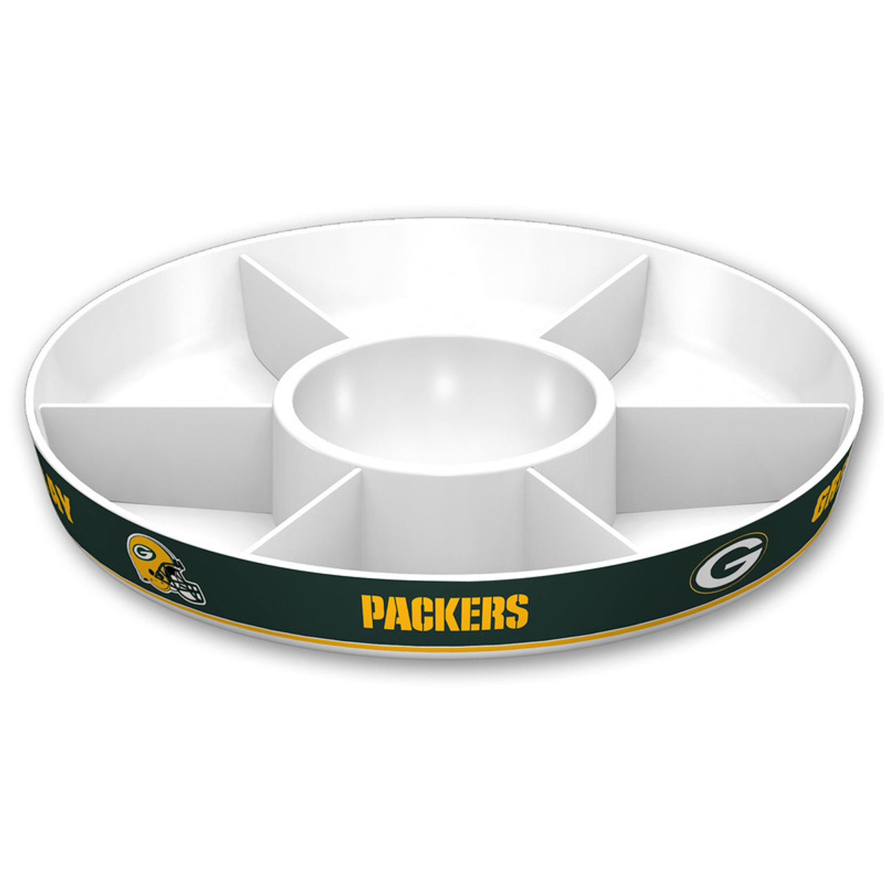 Snack in spirited style with this versatile Party Platter! Bright and bold 14 1/2" dia. melamine platter features your favorite football team graphics and colors and can be used alone or with custom dividers. Includes 6 removable dividers and a dipping bowl, so you can choose from 7 different serving configurations by simply sliding the slotted pieces together. Specify team. Hand wash with mild soap.