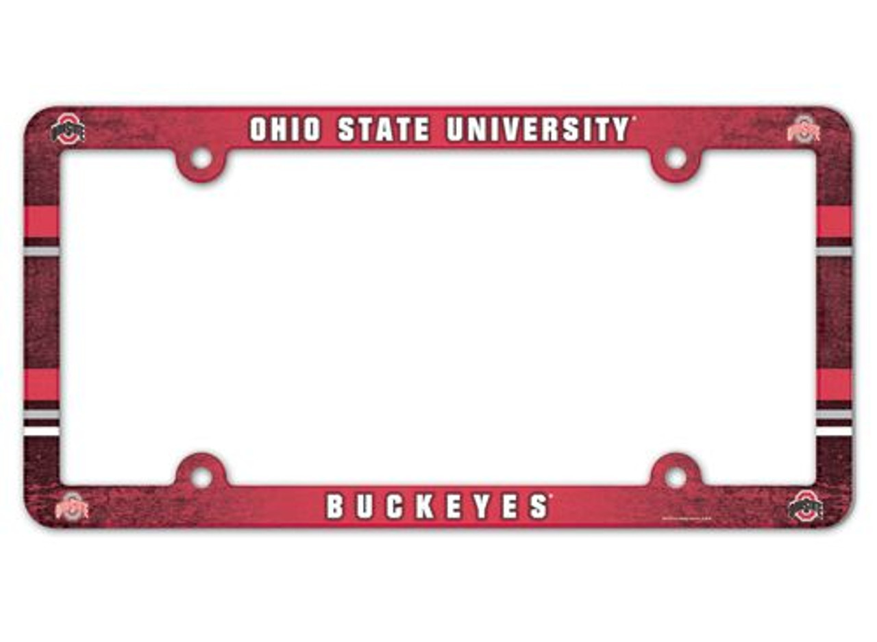 Full Color License Plate Frame that are usable as a fan decoration on the outside of a standard car license plate, front or back. The frame is molded in durable plastic and top surface printed with a durable ink on the entire top surface. The design maximizes space for tab sticker clearance, but you should still check the legalities of frames in your state. Made in USA. Made By Wincraft, Inc.