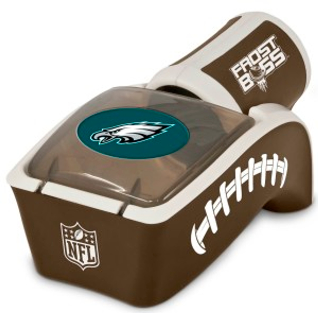 The newest and coolest way to turn your warm can of soda or beer into a frosty beverage! Its portable and can chill a can to 38 degrees in two minutes! The frost boss can cooler features your favorite NFL team's logo on the top! This is a must have item for tailgating, and is great for camping, fishing and hunting. Runs on 3 AA batteries, and requires ice. Made By Pangea Brands