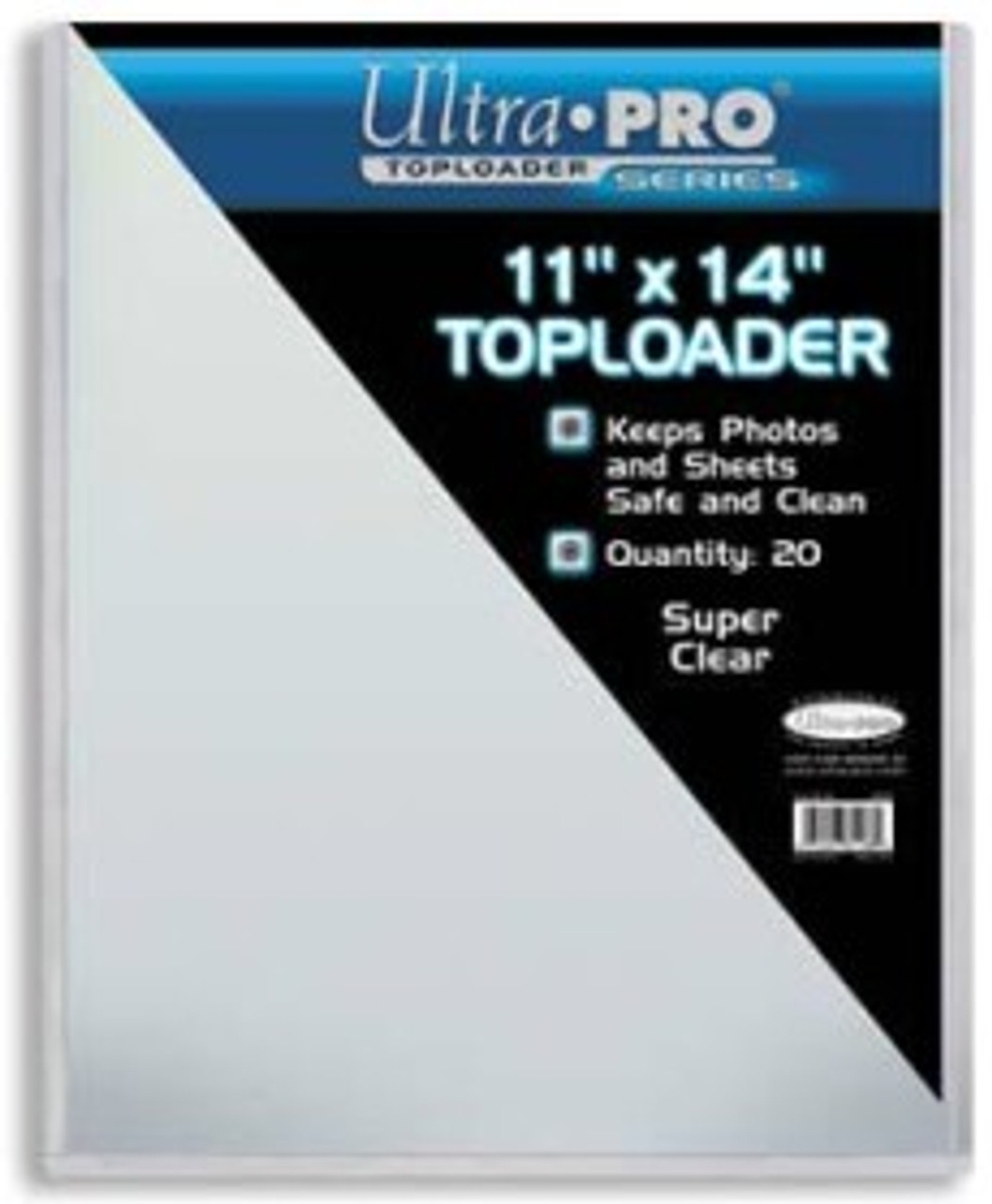11" x 14" (279.4 mm x 355.6 mm) toploader. Keeps cards, photos, magazines and other collectibles clean, recyclable. Packs of 20. Made by Ultra Pro