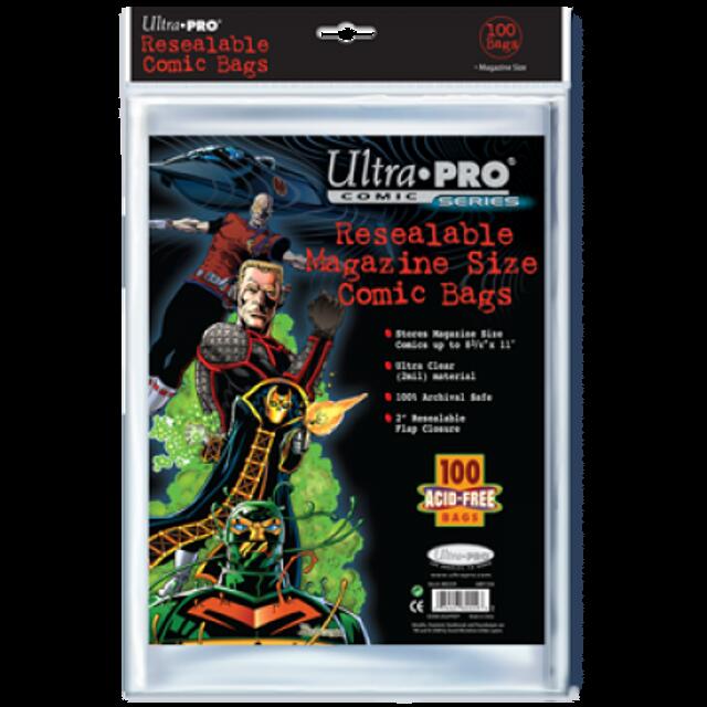Ultra clear, archival-safe comic bags designed to fit magazines, comics, photos and documents up to 8-3/4" x 11" in dimension. 100 per pack, acid-free and no PVC. Resealable flap provides extra protection and easy removal. Made by Ultra Pro