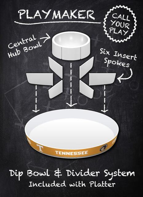 Snack in spirited style with this versatile Party Platter! Bright and bold 14 1/2" dia. melamine platter features your favorite football team graphics and colors and can be used alone or with custom dividers. Includes 6 removable dividers and a dipping bowl, so you can choose from 7 different serving configurations by simply sliding the slotted pieces together. Specify team. Hand wash with mild soap.