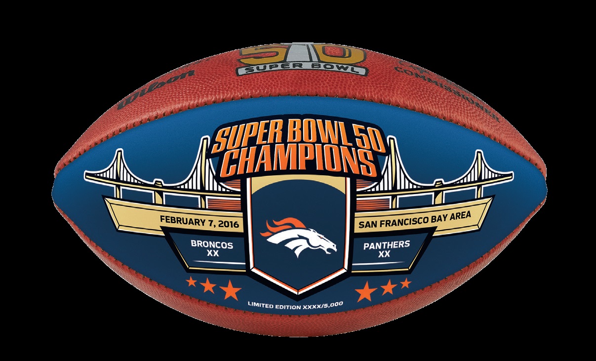 1 - Brand New, Denver Broncos Super Bowl 50 Champions GOLD PANEL NFL Authentic Game Football. This football is in the original factory box and is brand new, never used. The top of the line leather game ball designed for the highest level of competitive play. Wilson has been the Official Ball of the NFL since 1941. Patented 3-ply VPU bladder made in the USA to provide the best durability and air retention. Doubled-lacing re-enforces and raises the laces for enhanced grip when passing. Official size and weight. -
