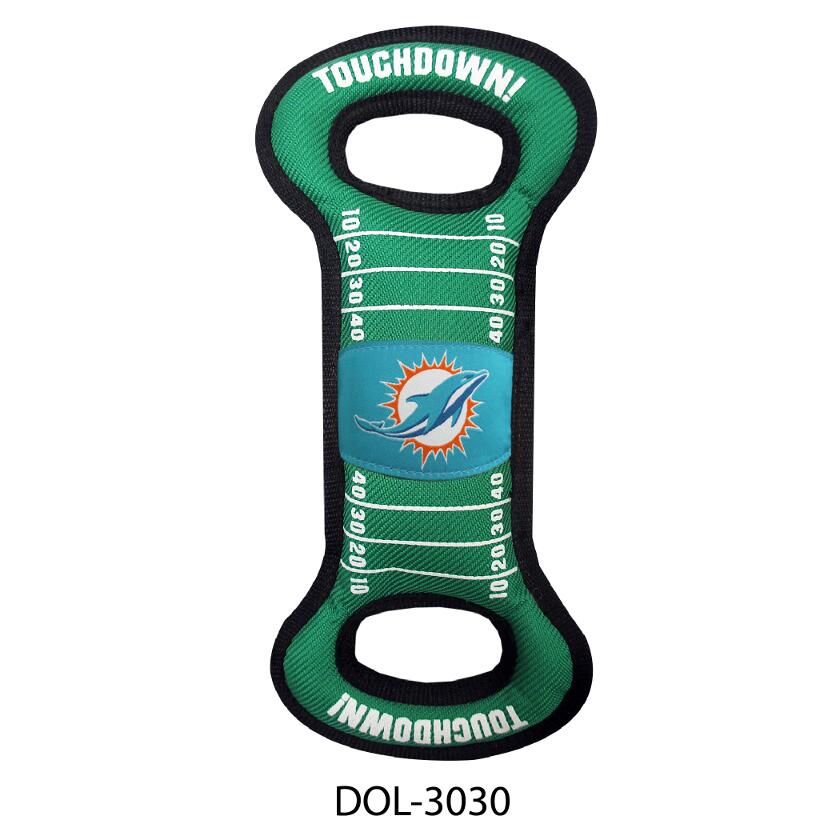 Tough Nylon tug toy, Polyfill and squeaker, Nylon web binding, Team woven logo over screened football field graphics This item cannot be returned for hygeniec reasons.