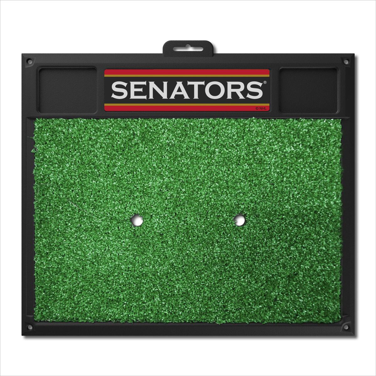 Work on your swing while showing off your team pride with Golf Hitting Mats from Sports Licensing Solutions! At the top of the mat is your teams name is molded in 3D and features true team colors. Made from a heavy duty vinyl base and filled with AstroTurf, this mat will save your lawn from any more divots. There are 2 Tee holes to allow both left and right handed golfers. A rubber tee is provided, but its removable to allow you to practice with your own tee. To maximize your time, next to the team logo are 2 cups to hold extra balls. The mat can be anchored to ground, with the 4 small holes the corners. This item is made to order and cannot be cancelled once it is ordered or returned for buyers remorse.
