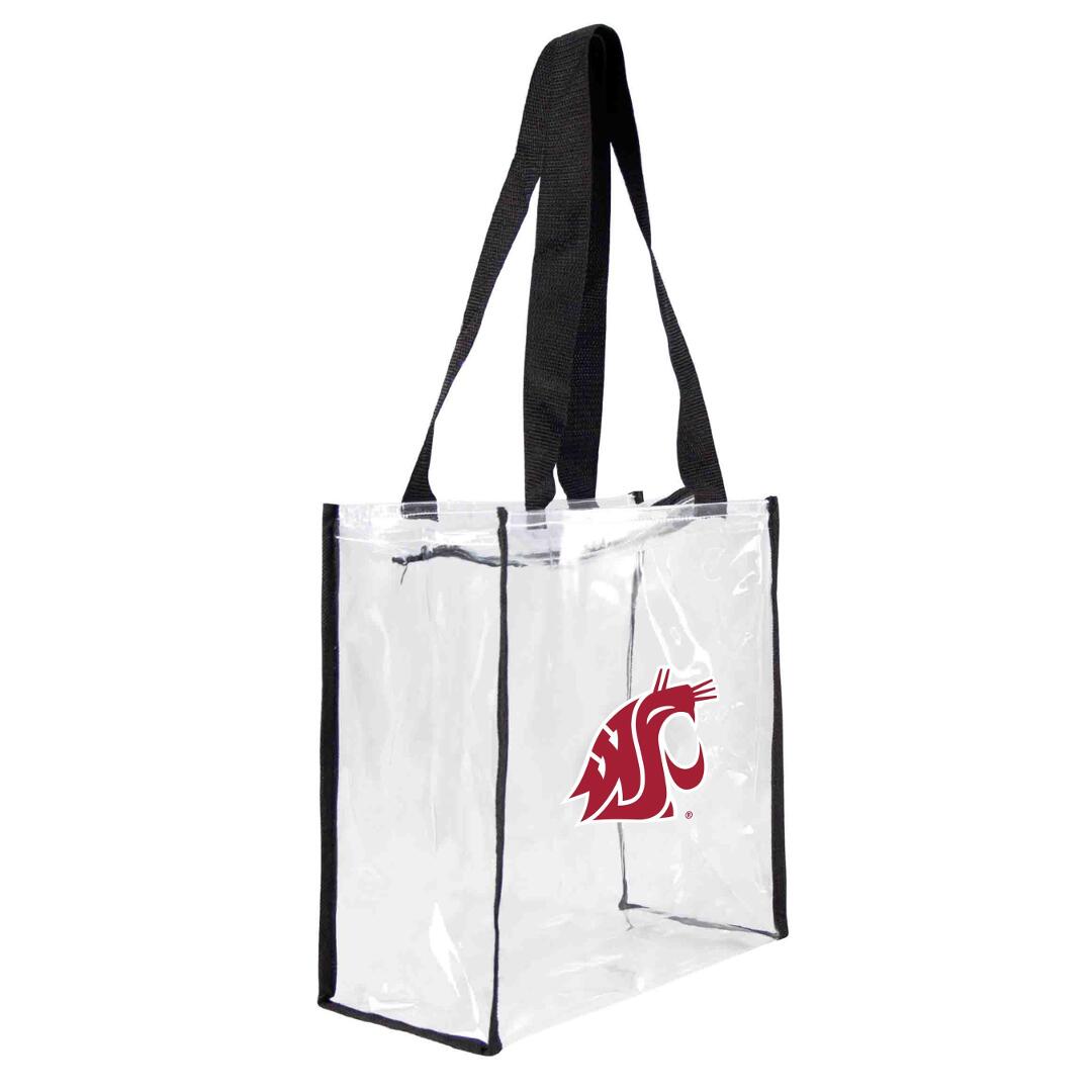 This stadium tote features a zipper and double shoulder straps. This bag is approved for use in stadiums. Two Webbing Shoulder Straps, Zipper Closure & made of 100% PVC, 100% Polyester Straps. The bag displays the "Stadium Friendly" tag. Dimensions: 11.5x11.5x5.5 inches. Made By Little Earth.