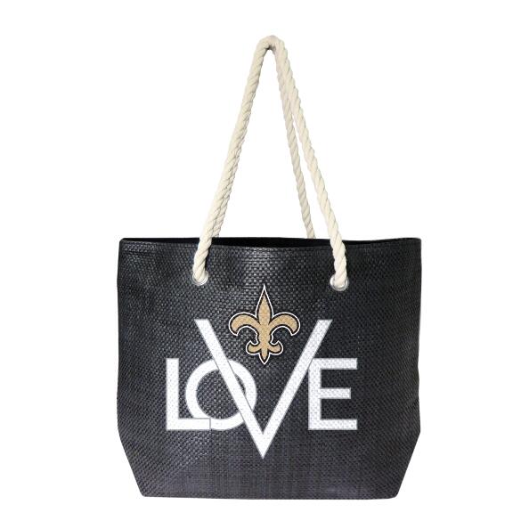 Be environmentally friendly and fashionable while carrying the Love Tote by Littlearth. Featuring a "love heart" and your team's full color logo, this light-weight tote is made of woven paper with a braided rope handle. Body material: 100% paper, Lining: 100% polyester, Handle: 100% cotton. Measures 20 inches wide, 6 inches deep, and 14 inches tall. Polyester lining with interior patch pocket