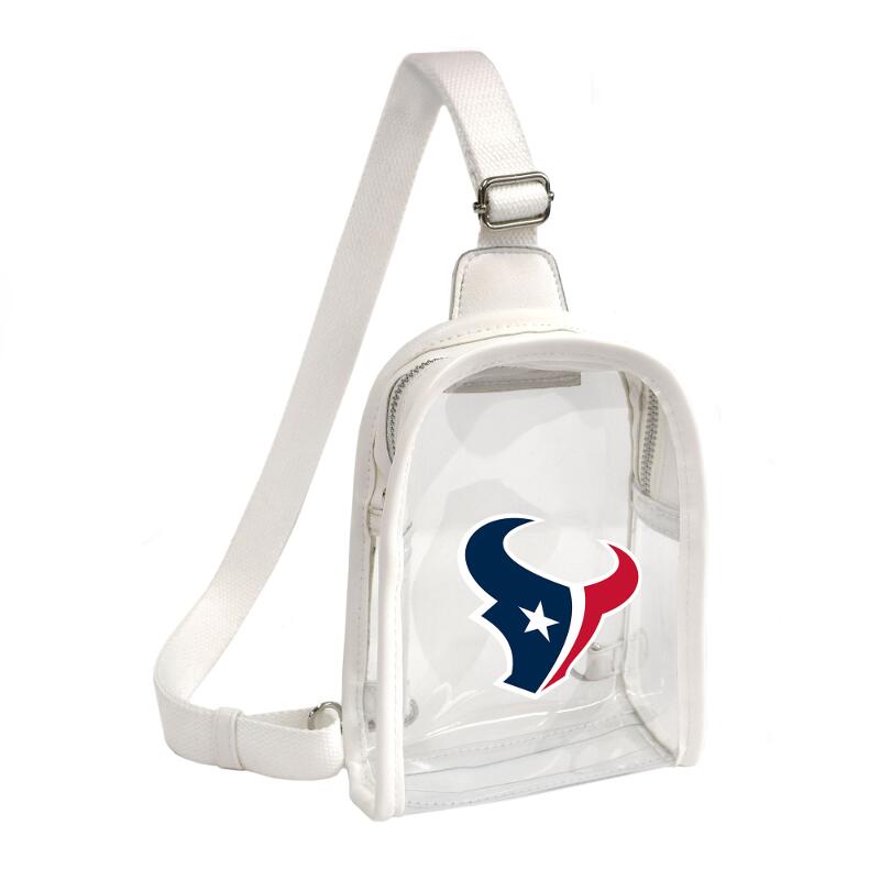 Go to games in style with these new Clear Stadium Sling Bags! This is a PVC Bag with polyester white trim and nickle plated hardware. The strap connects to either side of the bag with your favorite teams full color logo on it. These measure Length: 5.5", Width: 2.5", Height: 7.5"