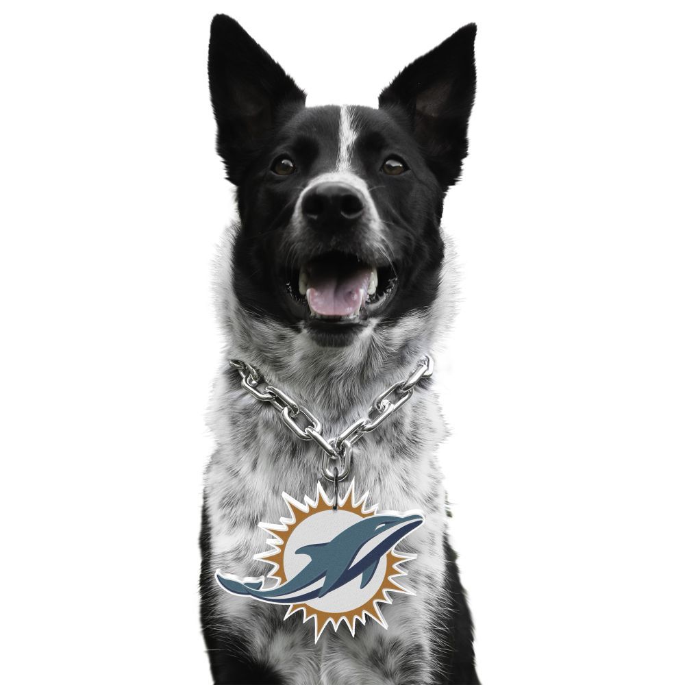 Prepare for a revolution in pet fashion with this Pet Fan Chain - the next big thing in showing off your furry friend's team spirit! It boasts a dazzling chrome-colored plastic chain adorned with a full-color foam team logo that leaps off your pet's fur. It's not just an accessory; it's a statement piece that demands attention! With adjustable chain links, it fits snugly on most dogs and cats, ensuring they strut their stuff in style. It features an adjustable strap locks that logo in place, so whether your pet is frolicking at the park or lounging at home, that emblem stays put! Wear it as a chic necklace for your pet or sling it confidently on their back - the choice is yours. The team logo isn't just any old insignia; it stands 5" tall and 5" wide, making sure everyone knows who your furry MVP is cheering for. Plus, we've thought of everything: a small strap that adjusts from 12" to 14" and a large one spanning 21" to 36", ensuring a comfortable and custom fit for pets of all sizes.