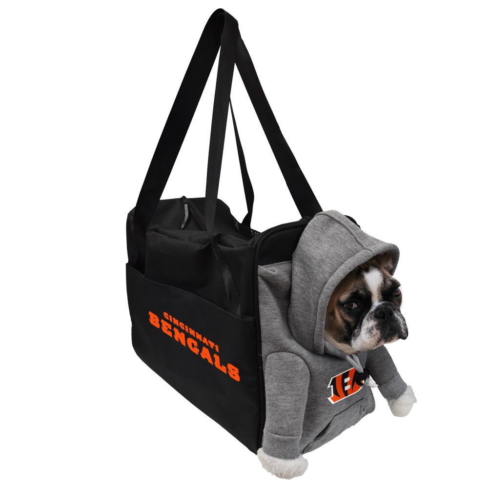 The Furry Fan Pet Carrier is the ultimate combination of style and functionality for pet owners who love to show off their team spirit! With its hoodie front adorned with a full-color team logo and wordmark, it's not only a carrier but also a fashion statement. The functional hood allows your pet to peek out comfortably, while the fabric "paws" add an adorable touch. Safety and comfort are paramount, with features like an adjustable cinch toggle and durable top zipper to keep your furry friend secure, and mesh panels for ample airflow. The sturdy 1.5" wide webbing straps with a 13" drop ensure easy carrying, and the removable inner pad makes cleaning a breeze. Plus, its practicality extends to travel, as it can be stowed beneath most standard airline seats, making it convenient for pet owners on the go. With dimensions of 16" in length, 8" in width, and 11" in height, it's spacious enough to accommodate pets up to 20 lbs while still being compact and manageable.