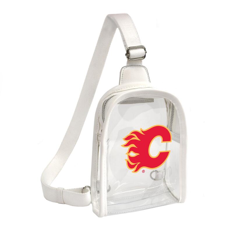 Go to games in style with these new Clear Stadium Sling Bags! This is a PVC Bag with polyester white trim and nickle plated hardware. The strap connects to either side of the bag with your favorite teams full color logo on it. These measure Length: 5.5", Width: 2.5", Height: 7.5"
