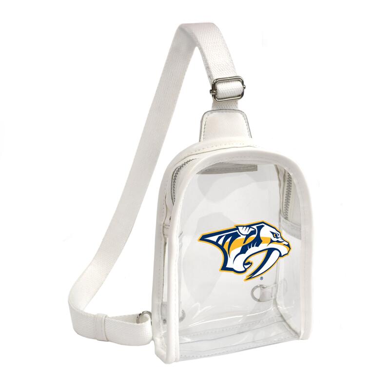 Go to games in style with these new Clear Stadium Sling Bags! This is a PVC Bag with polyester white trim and nickle plated hardware. The strap connects to either side of the bag with your favorite teams full color logo on it. These measure Length: 5.5", Width: 2.5", Height: 7.5"