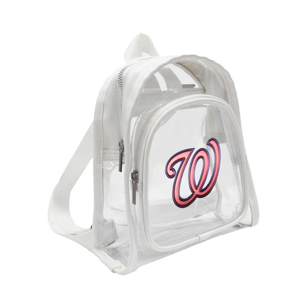 The Clear Mini Backpack combines style and functionality, crafted from durable 100% clear PVC. It features a large main compartment for your essentials and a small front compartment for added convenience. The bag showcases a vibrant 3D team-colored emblem, making it stand out. The leatherette zip panel and shiny nickel hardware add a touch of sophistication. Measuring 9” in height, 7” in width, and 2.8” in depth, this backpack is perfect for stadium events, as it complies with most stadium policies while offering both practicality and team pride.