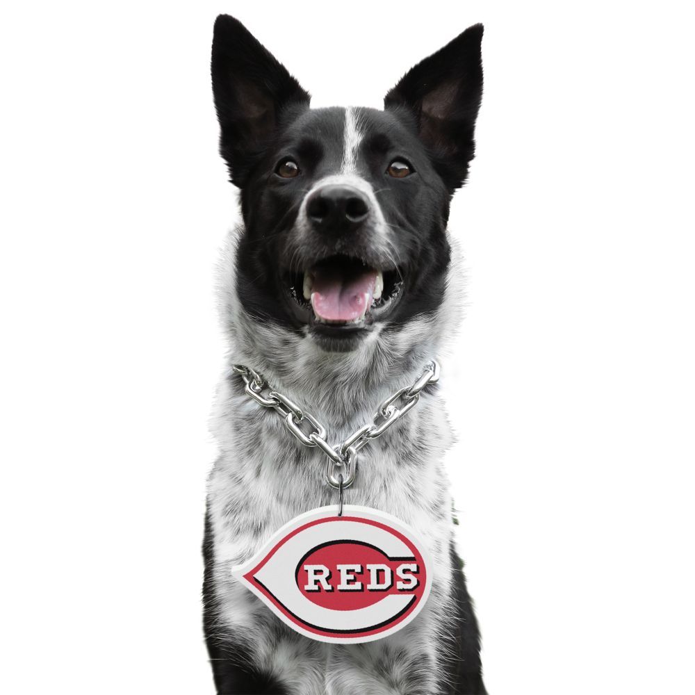Prepare for a revolution in pet fashion with this Pet Fan Chain - the next big thing in showing off your furry friend's team spirit! It boasts a dazzling chrome-colored plastic chain adorned with a full-color foam team logo that leaps off your pet's fur. It's not just an accessory; it's a statement piece that demands attention! With adjustable chain links, it fits snugly on most dogs and cats, ensuring they strut their stuff in style. It features an adjustable strap locks that logo in place, so whether your pet is frolicking at the park or lounging at home, that emblem stays put! Wear it as a chic necklace for your pet or sling it confidently on their back - the choice is yours. The team logo isn't just any old insignia; it stands 5" tall and 5" wide, making sure everyone knows who your furry MVP is cheering for. Plus, we've thought of everything: a small strap that adjusts from 12" to 14" and a large one spanning 21" to 36", ensuring a comfortable and custom fit for pets of all sizes.