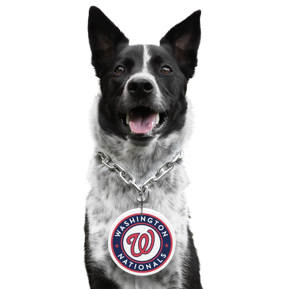 Prepare for a revolution in pet fashion with this Pet Fan Chain - the next big thing in showing off your furry friend's team spirit! It boasts a dazzling chrome-colored plastic chain adorned with a full-color foam team logo that leaps off your pet's fur. It's not just an accessory; it's a statement piece that demands attention! With adjustable chain links, it fits snugly on most dogs and cats, ensuring they strut their stuff in style. It features an adjustable strap locks that logo in place, so whether your pet is frolicking at the park or lounging at home, that emblem stays put! Wear it as a chic necklace for your pet or sling it confidently on their back - the choice is yours. The team logo isn't just any old insignia; it stands 5" tall and 5" wide, making sure everyone knows who your furry MVP is cheering for. Plus, we've thought of everything: a small strap that adjusts from 12" to 14" and a large one spanning 21" to 36", ensuring a comfortable and custom fit for pets of all sizes.