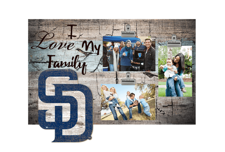 Our I Love My Family 11x19 Clip Frame is the perfect way to show your team spirit and love for your family at the same time. With a distressed wood look background and your favorite team's logo on the bottom left, this frame will add a touch of rustic charm to any room. The phrase "I Love My Family" is printed above the logo, making it a great gift for a loved one or a family member.