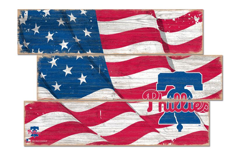 Here's a great way to display your fan loyalty with this cool three plank wall sign by Fan Creations wth your team's logo and the American Flag! Digitally printed on Medium Density Fibreboard (MDF), it features three individual 6" x 24" panels and a distressed white background with team logos, team name and date established. Proudly hang it in the office, the game room or man cave.
