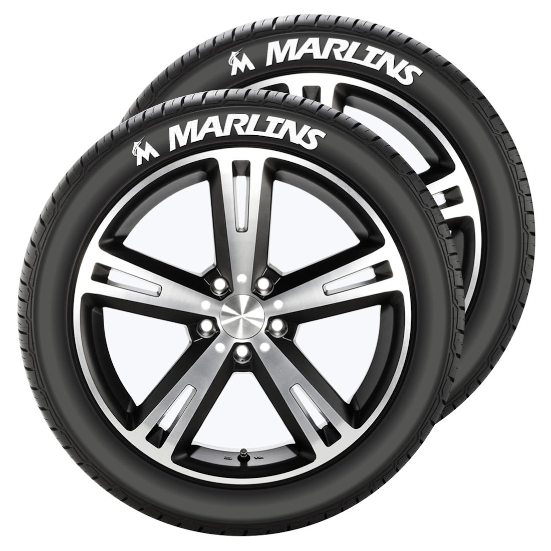 Show your team pride with these easy to apply Miami Marlins Tire Tatz. The raised white ruMiami Marlins er decals provide a great look for any tire. Quality decals made of a ruMiami Marlins er compound will last the life of the tire. Includes adhesive for easy application. The kit includes a pair of decals for 2 tires. Tire Tatz measure approximate 9in x 1.5in and will fit on any tire with a 2 inch sidewall.