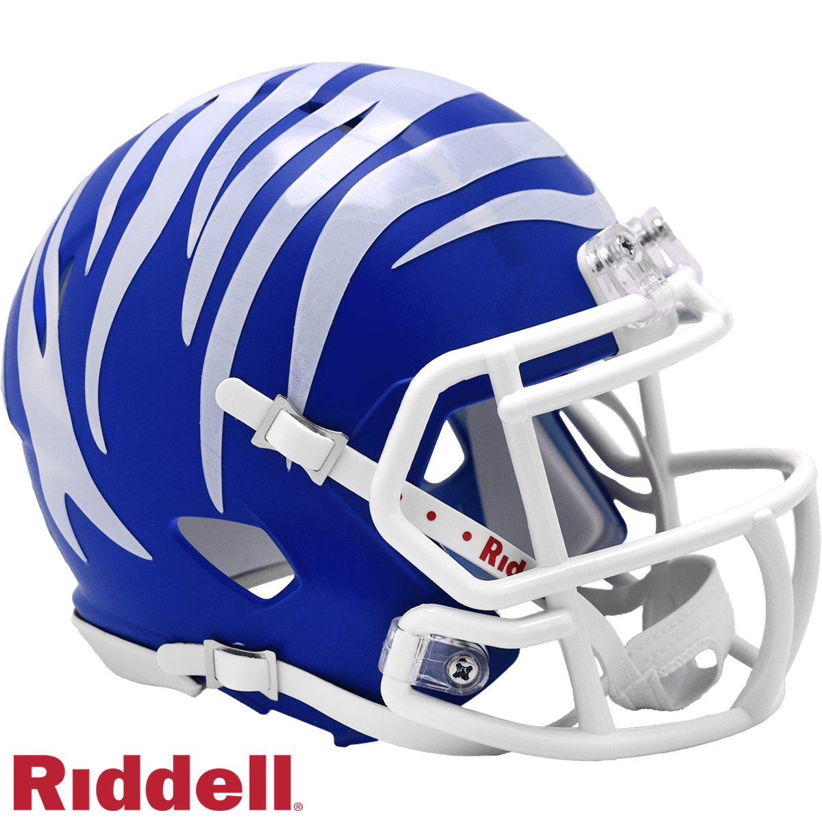 Memphis Tigers Mini Speed College Football Helmet. The ultimate NCAA College mini speed football helmet collectible, perfect NCAA mini speed football helmets for autographs and collectors. Mini Speed Football Helmet with great graphics. Official NCAA Mini Speed Football Helmet with official NCAA team decal. ABS plastic Mini Speed Football Helmet shells with plastic facemask. Realistic interior foam padding, vinyl-leather chin strap. This is an affordable NCAA football helmet for the true fan. Size: 1/2 scale versions of NCAA football helmets. Size: 6"(L), 4½"(W), 5"(H) - (NOT FOR WEARING).