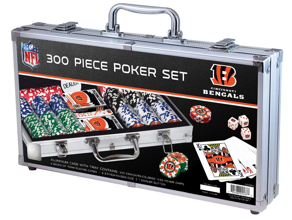 Up the Ante with this 300 Piece Game Chips Set. This portable set features 300 high-quality 11.5-gram casino-style Game Chips in five different colors with team designs. The set also includes two decks of custom team playing cards, a dealer button, and 6 team dice all housed in a sleek aluminum carrying case. This Game Chips Set is ideal for Texas Hold’em, Blackjack, tournaments, card clubs, and more! Support your favorite college with officially licensed and approved products. Perfect for all fans! Game Chips Set Includes: -300 standard-colored game chips (11.5g) featuring two team designs. 60 White Chips, 60 Red Chips, 60 Blue Chips, 60 Green Chips, 60 Black Chips. -6 standard size (16mm) dice featuring your teams logo and colors on each die. -2 Decks of Playing Cards. Card-back designs feature your favorite team’s logo. All face cards and jokers have detailed, custom team designs. Each standard deck includes 52 cards and 2 Jokers. -1 Dealer Button -Easy to carry sturdy Aluminum case with black velour interior to protect and organize poker chips, playing cards, and dice.