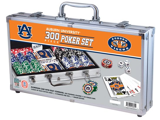 Up the Ante with this 300 Piece Game Chips Set. This portable set features 300 high-quality 11.5-gram casino-style Game Chips in five different colors with team designs. The set also includes two decks of custom team playing cards, a dealer button, and 6 team dice all housed in a sleek aluminum carrying case. This Game Chips Set is ideal for Texas Hold’em, Blackjack, tournaments, card clubs, and more! Support your favorite college with officially licensed and approved products. Perfect for all fans! Game Chips Set Includes: -300 standard-colored game chips (11.5g) featuring two team designs. 60 White Chips, 60 Red Chips, 60 Blue Chips, 60 Green Chips, 60 Black Chips. -6 standard size (16mm) dice featuring your teams logo and colors on each die. -2 Decks of Playing Cards. Card-back designs feature your favorite team’s logo. All face cards and jokers have detailed, custom team designs. Each standard deck includes 52 cards and 2 Jokers. -1 Dealer Button -Easy to carry sturdy Aluminum case with black velour interior to protect and organize poker chips, playing cards, and dice.