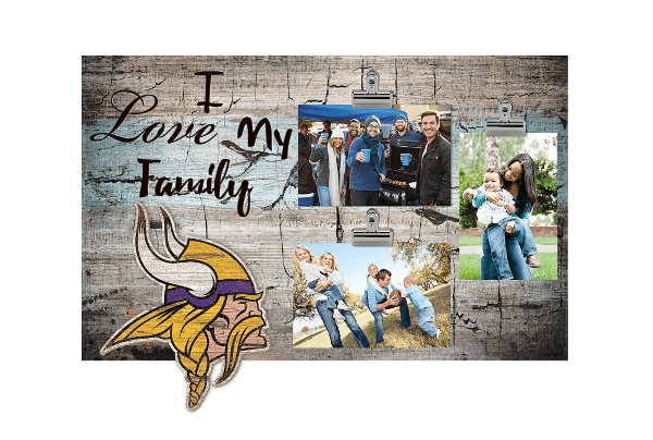 Our I Love My Family 11x19 Clip Frame is the perfect way to show your team spirit and love for your family at the same time. With a distressed wood look background and your favorite team's logo on the bottom left, this frame will add a touch of rustic charm to any room. The phrase "I Love My Family" is printed above the logo, making it a great gift for a loved one or a family member.