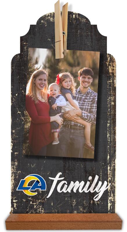 Display your family memories with this 6x12 piece that features your favorite team's logo and a clip above it to hang your photo. The bottom of the piece says "Family" with your team's logo beside it. Cut and printed on MDF, Made in the USA