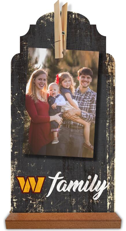 Display your family memories with this 6x12 piece that features your favorite team's logo and a clip above it to hang your photo. The bottom of the piece says "Family" with your team's logo beside it. Cut and printed on MDF, Made in the USA