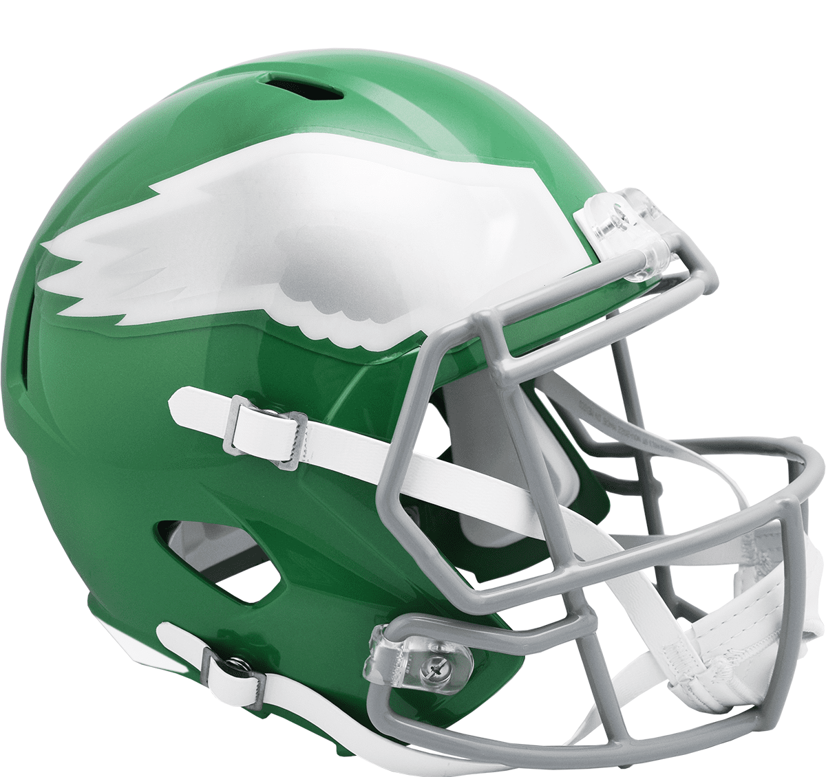 Philadelphia Eagles Full Size Speed Replica NFL Helmet by Riddell. This full size Philadelphia Eagles helmet is designed with a non-wear plate and molded foam jaw pads. a steel polyvinyl-coated face mask, 4-pt chin strap, and elliptical air vents. NFL Team name on back bumper (except Chiefs, Steelers and Giants). The officially licensed NFL helmet is great for autographs and features Philadelphia Eagles team logo decals on both sides. The striking shape of the future. NFL Bears Replica Speed helmet size medium measures: 12.75"(L), 9.25"(W), 9.75"(H). NFL Philadelphia Eagles Full Size Speed Replica Helmet. (NOT FOR WEARING)