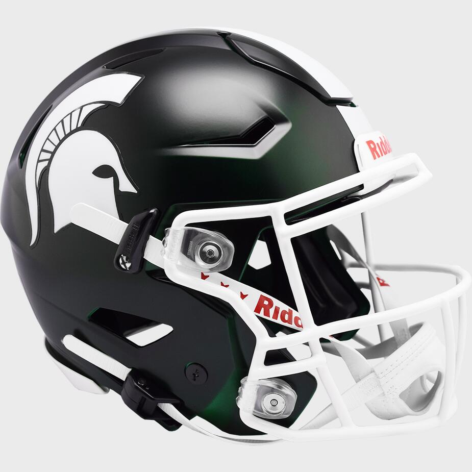 Buy this collectible, new, pro Authentic SpeedFlex Full Size Football Helmet, made by Riddell and officially licensed by the NCAA, in a clear plastic bag in cardboard display packaging. Also commonly referred to as a revolution speedflex or proline, its the official, on-field, actual, exact, same, genuine, real, game, competition, player, playing helmet and was designed to further reduce the likelihood of concussions. The SpeedFlex helmet has quickly become the most popular helmet of choice by top NCAA players. The SpeedFlex helmet is the most authentically-inspired collectible in Riddells line. The unmistakable look of the SpeedFlex helmet has become the new icon of the game. Helmet Features Kra-Lite II Polycarbonate Lexan plastic SpeedFlex style shell with extended mandible (jaw area) protection, raised center with hexagon-shaped (6-sided) impact absorption cut-out, 6- elliptical air vents (3 on each side), 2- earholes (1 on each side), and painted high gloss shine finish (unless Chrome mirror finish, Matte dull flat finish, or Satin smooth gloss shine finish is in this items name) 4- plastic clips and 4- metal stainless steel rivets (2 pairs on each side) attach on a polyvinyl-coated steel SF-2B-SW style quick-release facemask with high gloss shine finish (unless Chrome mirror finish is in this items name) Team city or name flat decal, team logo flat decal, or blank rubber vinyl front (forehead) bumper (varies by team) Team city or name flat decal on rubber vinyl back rear (neck) bumper (CLE, KCC, NYG, PIT, and WAS are blank) Functional air bladder with 2 inflation points snap-out interior padding, comfort overliner, and molded foam jaw pads Blank rubber vinyl stitched leather 4-point chinstrap with 4- adjustment points (2 on each side) Team color(s), logo(s) decal(s) (if any, varies by team), and stripe(s) decal(s) (if any, varies by team) NFL logo decal on back rear Outside dimensions 13 12 L x 9 34 W x 10 14 H Size Large shell Unsafe for play, because not professionally fitted