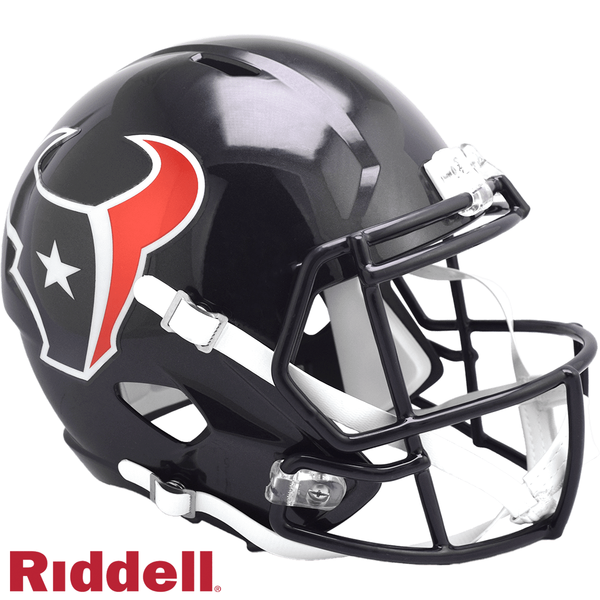 Houston Texans Full Size Authentic Revolution Speed NFL Helmet by Riddell. This full size Texans helmet is designed with extended mandible (jaw area) protection, a steel polyvinyl-coated face mask, chin strap, increased padding, an integrated facemask attachment system and elliptical air vents. NFL Team name on back bumper (except Chiefs, Steelers and Giants). The officially licensed Houston Texans helmet is great for autographs and features Texans team logo decals on both sides. The striking shape of the future. NFL Texans Authentic Revolution Speed helmet size is 13.5"(L) x 9.75"(W) x 10.25"(H). NFL Houston Texans Full Size Helmet.