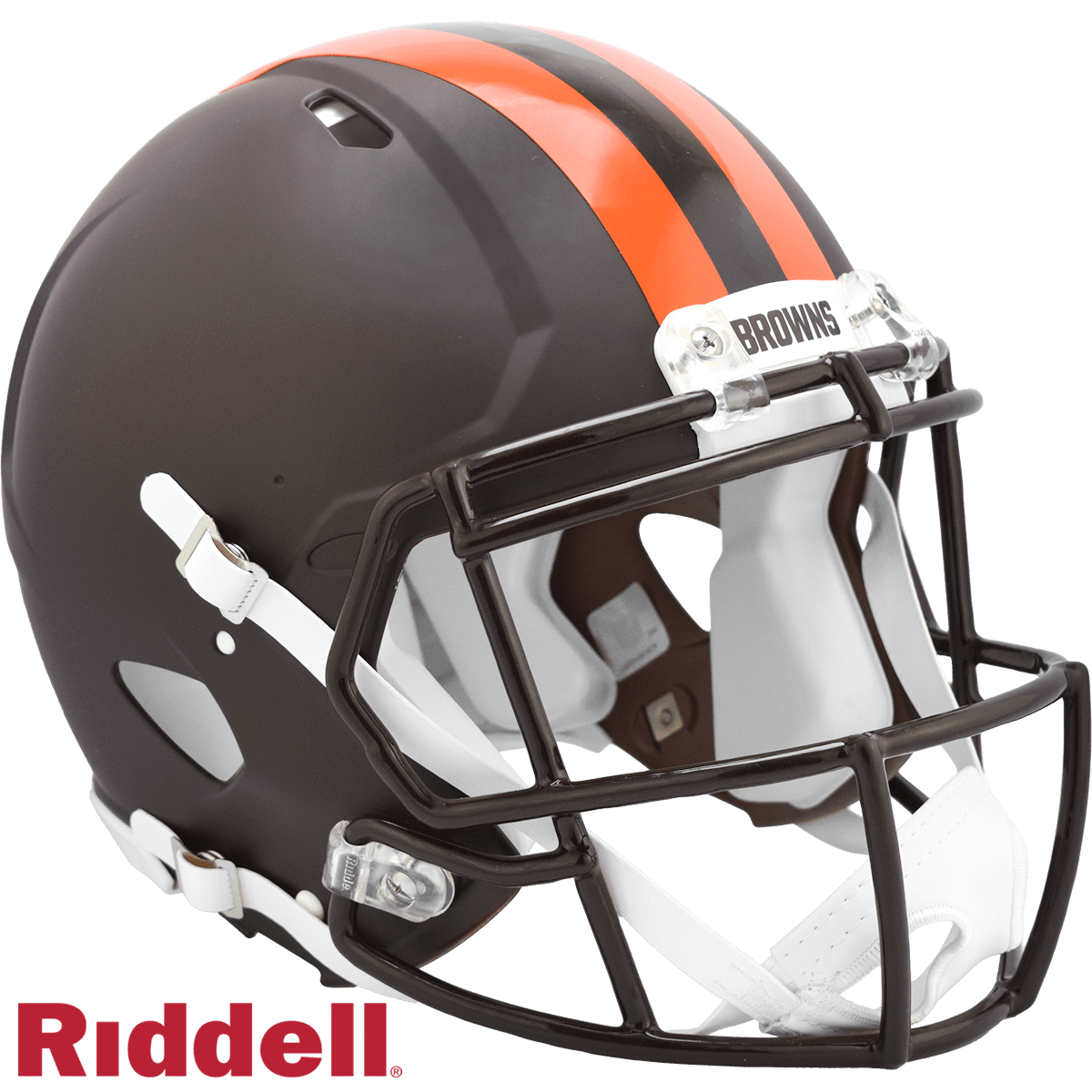 Cleveland Browns Full Size Authentic Revolution Speed NFL Helmet by Riddell. This full size Browns helmet is designed with extended mandible (jaw area) protection, a steel polyvinyl-coated face mask, chin strap, increased padding, an integrated facemask attachment system and elliptical air vents. NFL Team name on back bumper (except Chiefs, Steelers and Giants). The officially licensed Cleveland Browns helmet is great for autographs and features Browns team logo decals on both sides. The striking shape of the future. NFL Browns Authentic Revolution Speed helmet size is 13.5"(L) x 9.75"(W) x 10.25"(H). NFL Cleveland Browns Full Size Helmet.