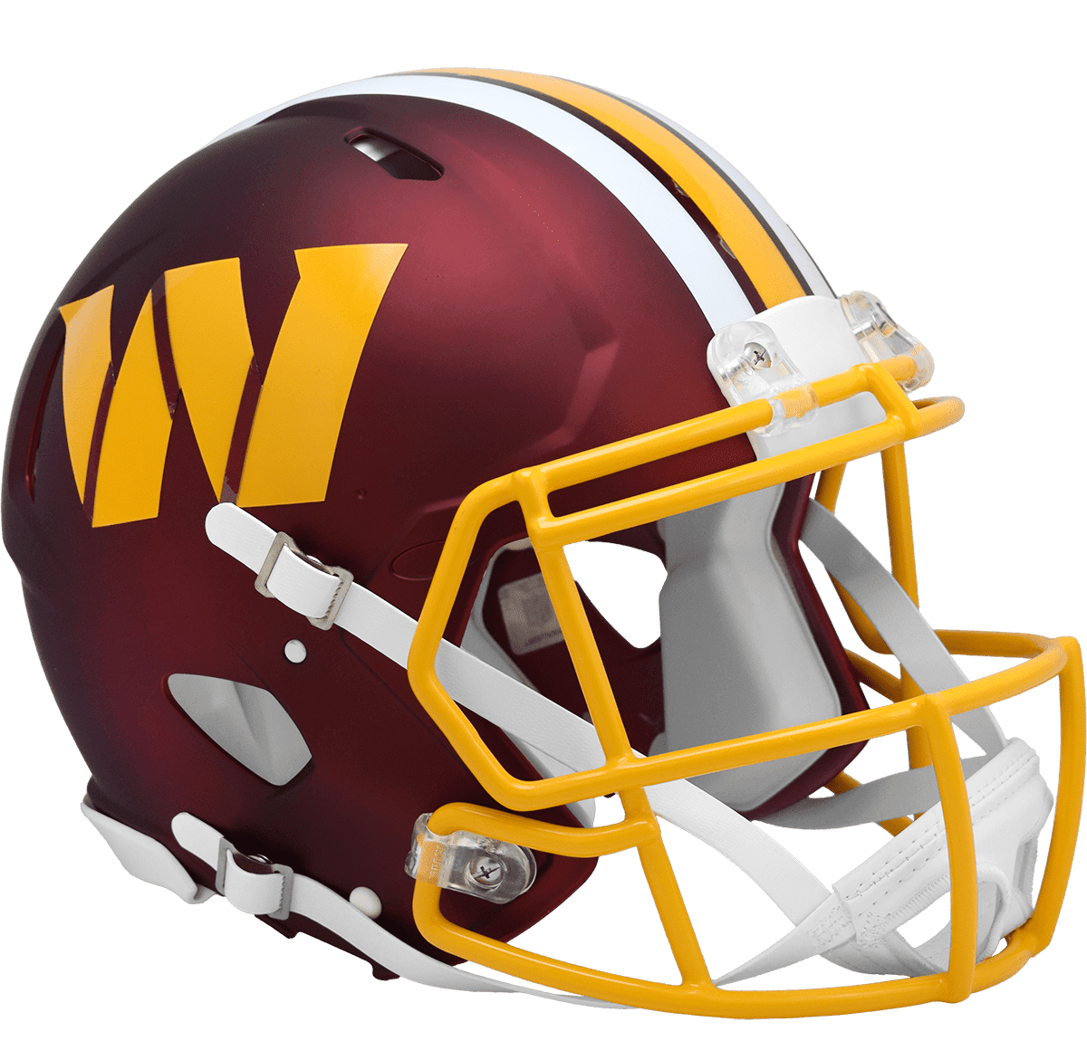 Washington Commanders Full Size Authentic Revolution Speed NFL Helmet by Riddell. This full size Ravens helmet is designed with extended mandible (jaw area) protection, a steel polyvinyl-coated face mask, chin strap, increased padding, an integrated facemask attachment system and elliptical air vents. NFL Team name on back bumper (except Chiefs, Steelers and Giants). The officially licensed Washington Commanders helmet is great for autographs and features Ravens team logo decals on both sides. The striking shape of the future. NFL Ravens Authentic Revolution Speed helmet size is 13.5"(L) x 9.75"(W) x 10.25"(H). NFL Washington Commanders Full Size Helmet.