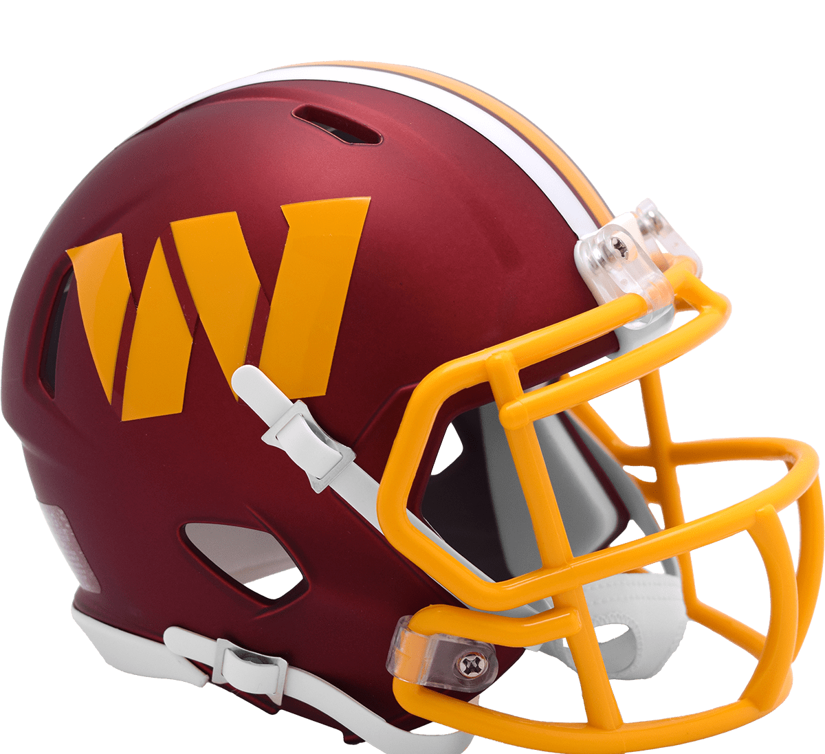 Washington Commanders Mini Speed Football Helmet. The ultimate NFL mini speed football helmet collectible, perfect NFL mini speed football helmets for autographs and collectors. Mini Speed Football Helmet with great graphics. Official NFL Mini Speed Football Helmet with official NFL team decal. ABS plastic Mini Speed Football Helmet shells with plastic facemask. Realistic interior foam padding, vinyl-leather chin strap. This is an affordable NFL football helmet for the true fan. Size: 1/2 scale versions of NFL football helmets. Size: 6"(L), 4½"(W), 5"(H) - (NOT FOR WEARING).