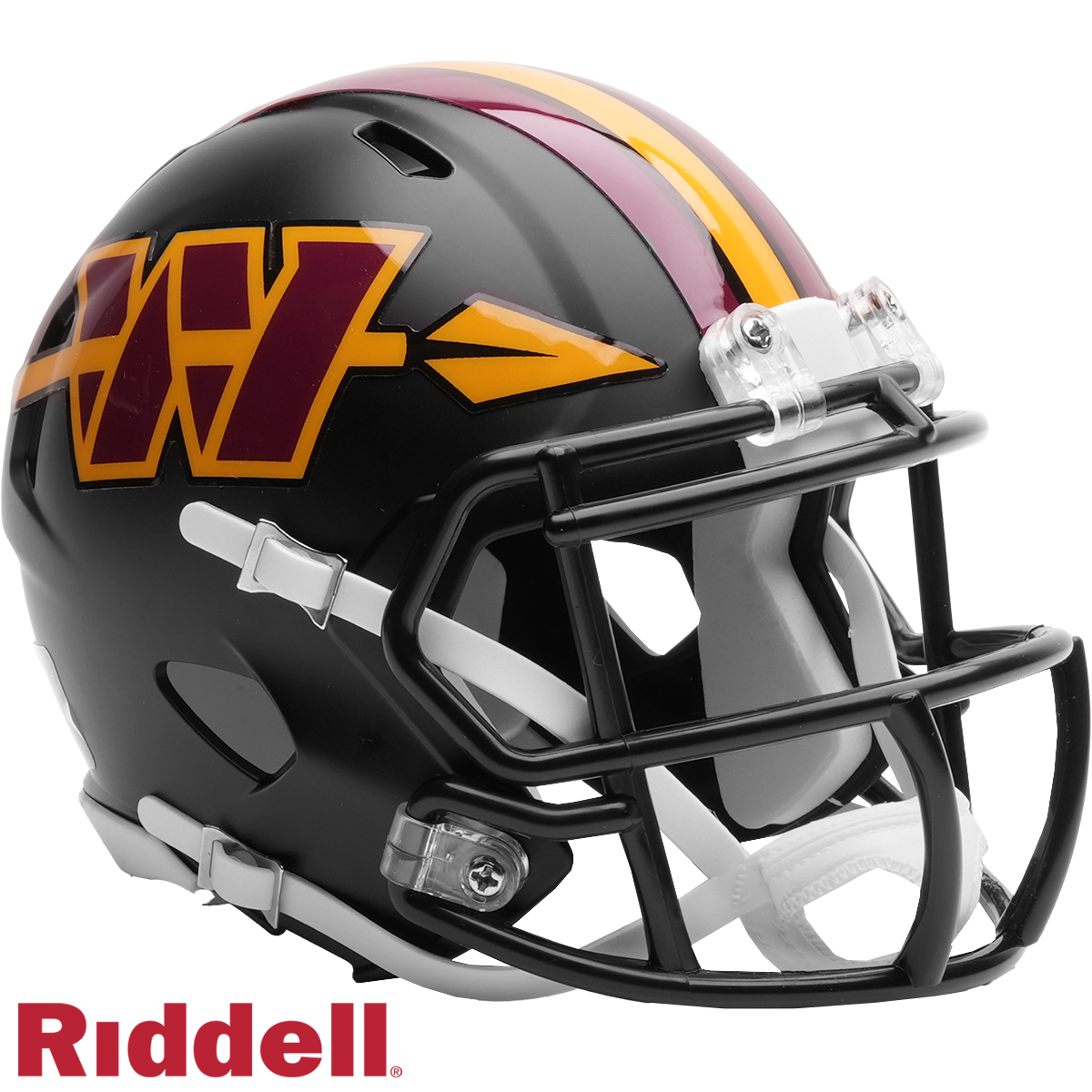 Washington Commanders Mini Speed Football Helmet. The ultimate NFL mini speed football helmet collectible, perfect NFL mini speed football helmets for autographs and collectors. Mini Speed Football Helmet with great graphics. Official NFL Mini Speed Football Helmet with official NFL team decal. ABS plastic Mini Speed Football Helmet shells with plastic facemask. Realistic interior foam padding, vinyl-leather chin strap. This is an affordable NFL football helmet for the true fan. Size: 1/2 scale versions of NFL football helmets. Size: 6"(L), 4½"(W), 5"(H) - (NOT FOR WEARING).