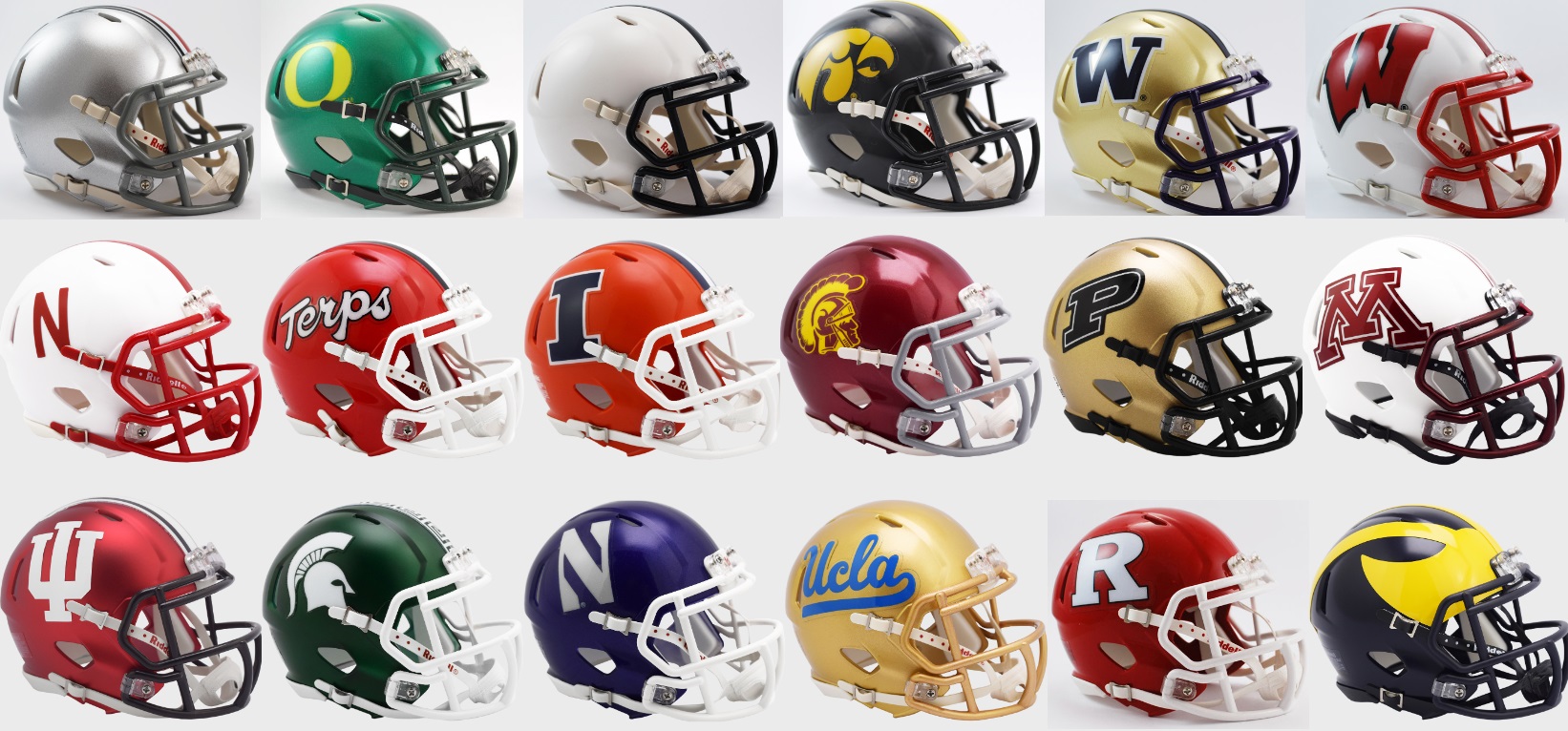 You will receive mini helmets for these teams: University of Michigan, Northwestern University, Wisconsin University, University of Illinois, Penn State University, Ohio State University, Michigan State University, Purdue University, University of Minnesota, Indiana University, University of Iowa, University of Nebraska, Rutgers University, Oregon, UCLA, USC, Washington and University of Maryland.