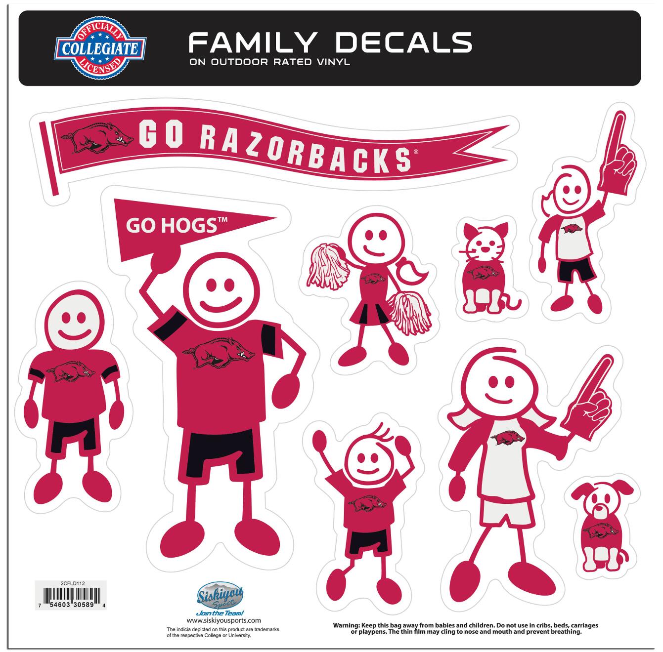 Show off your team pride with our Arkansas Razorbacks family automotive decals. The set has individual family themed decals that each feature the team logo. The 11 x 11 inch decal set is made of outdoor rated, repositionable vinyl for durability and easy application.