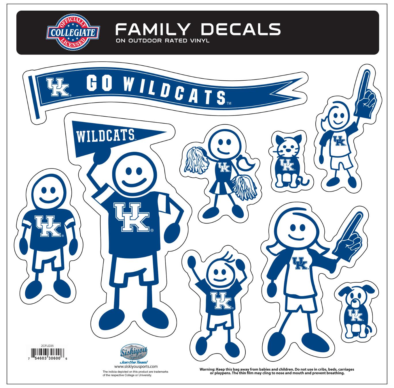 Show off your team pride with our Kentucky Wildcats family automotive decals. The set has individual family themed decals that each feature the team logo. The 11 x 11 inch decal set is made of outdoor rated, repositionable vinyl for durability and easy application.