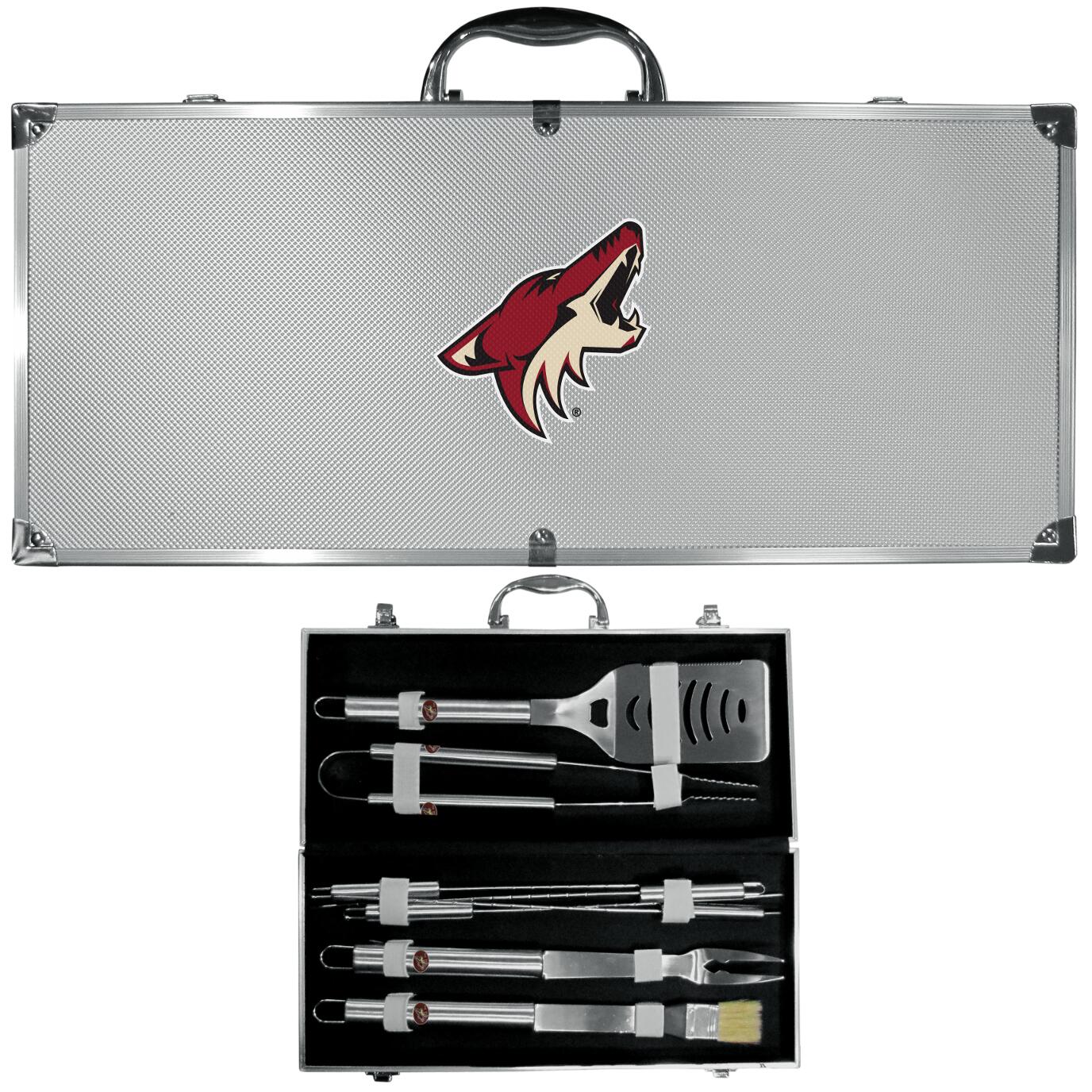 This is the ultimate Arizona Coyotes tailgate accessory! The high quality, 420 grade stainless steel tools are durable and well-made enough to make even the pickiest grill master smile. This complete grill accessory kit includes; 4 skewers, spatula with bottle opener and serrated knife edge, basting brush, tongs and a fork. The 18 inch metal carrying case makes this a great outdoor kit making grilling an ease while camping, tailgating or while having a game day party on your patio. The tools are 17 inches long and feature a metal team emblem. The metal case features a large, metal team emblem with exceptional detail. This high-end men's gift is sure to be a hit as a present on Father's Day or Christmas.