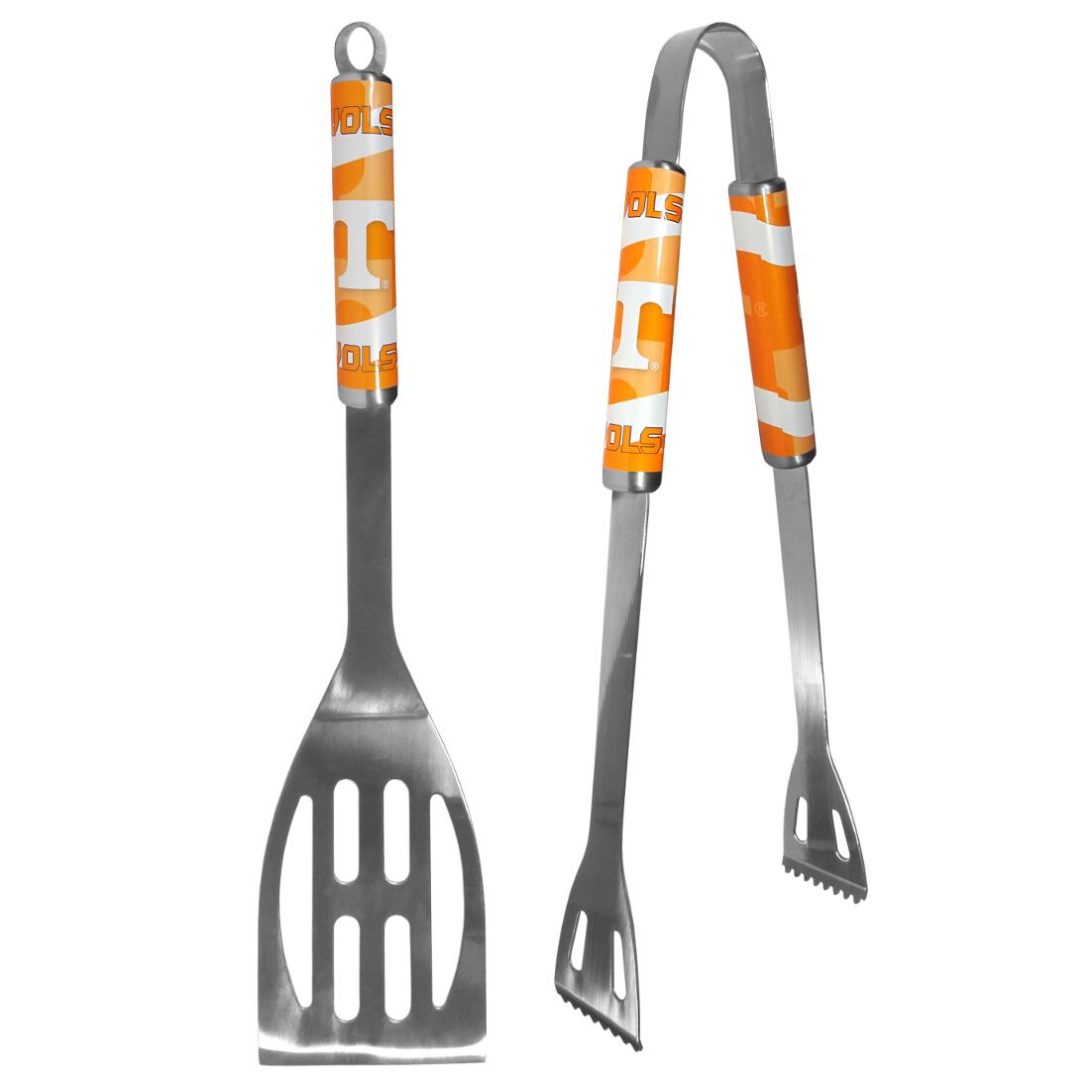 This stainless steel 2 pc BBQ set is a tailgater's best friend. The colorful and large team graphics let's everyone know you are a fan! The set in includes a spatula and tongs with the Tennessee Volunteers proudly display on each tool.