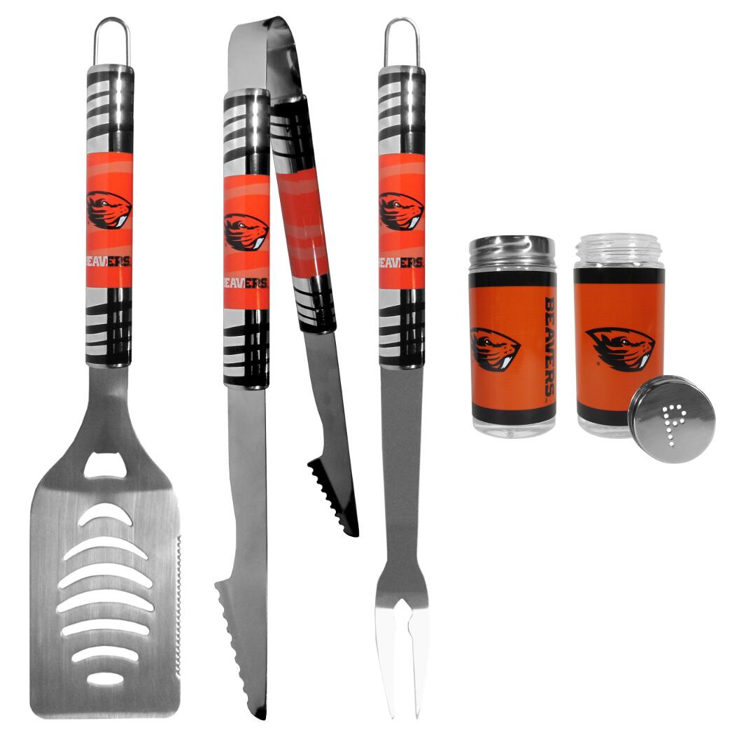 The eye-catching chrome graphics on this set make it a game day favorite! The high-quality, 440 grade stainless steel 3 pc Oregon St. Beavers BBQ grill set will make any grill master smile. These barbeque tools are made to last and the tool set includes a large spatula with a bottle opener feature and sharp serrated edge, strong tongs and fork. The 16 inch length keeps you far from the flames. Add in our classic salt and pepper shakers and you?re ready for any game day event! The diner replica salt and pepper shakers are glass with screw top lids and team graphics on the front.
