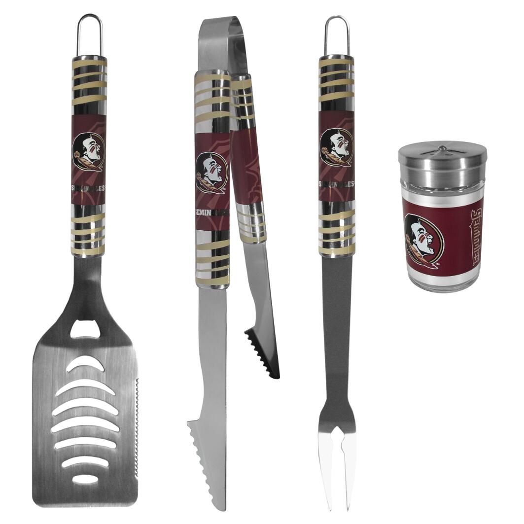 The eye-catching chrome graphics on this set make it a game day favorite! The high-quality, 420 grade stainless steel 3 pc Florida State Seminoles BBQ grill set will make any grill master smile. These barbeque tools are made to last and the tool set includes a large spatula with a bottle opener feature and sharp serrated edge, strong tongs and fork. The 16 inch length keeps you far from the flames. Paired with our tailgater season shakers and you’re ready for any game day event! This compact shaker is 2 inch tall with a twist top that closes off the holes at the top making it perfect for travel preventing those messy spills. The shaker has wide holes perfect for keeping your pepper seeds or cheese toppings.